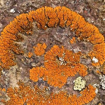 The Crustose, or "flame" lichens are flat, often circular patches, tightly adhered to their substrate. Colorful fruiting bodies adorn their cortex. The chemicals in these lichens are capable of penetrating and breaking down the rock. As the lichens die the debris becomes thicker and nitrogen rich. Mosses began to grow. The decay of the mosses and lichens make the soil even richer, allowing other vegetation to take hold and a new habitat evolves.