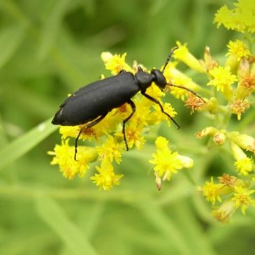 The Florida Blister Beetle, depicted, represents a host of species of insects lured to flowers seeking their nectar, and end up picking up pollen on their bodies and pollinating surrounding flowers. Florida hosts 26 species of this beetle, out of 2500 total related species around the world.