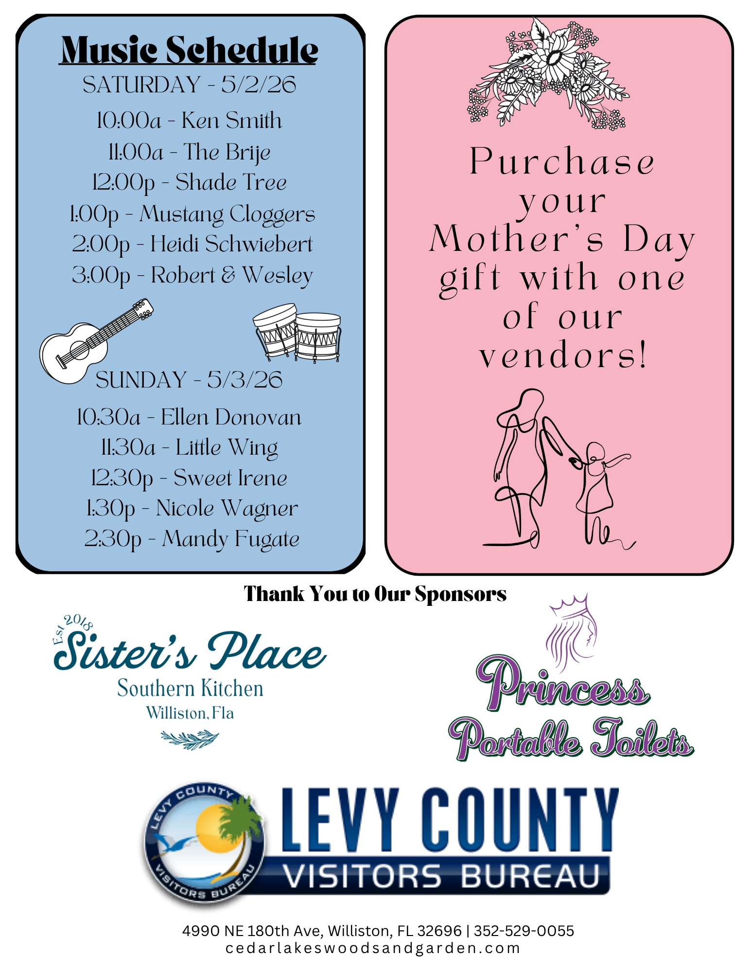 Join us May 2-3 for the ultimate spring celebration! We invite residents of Alachua County, Marion County, Levy County, and surrounding areas to discover unique treasures and enjoy the outdoors at one of our largest events of the year.