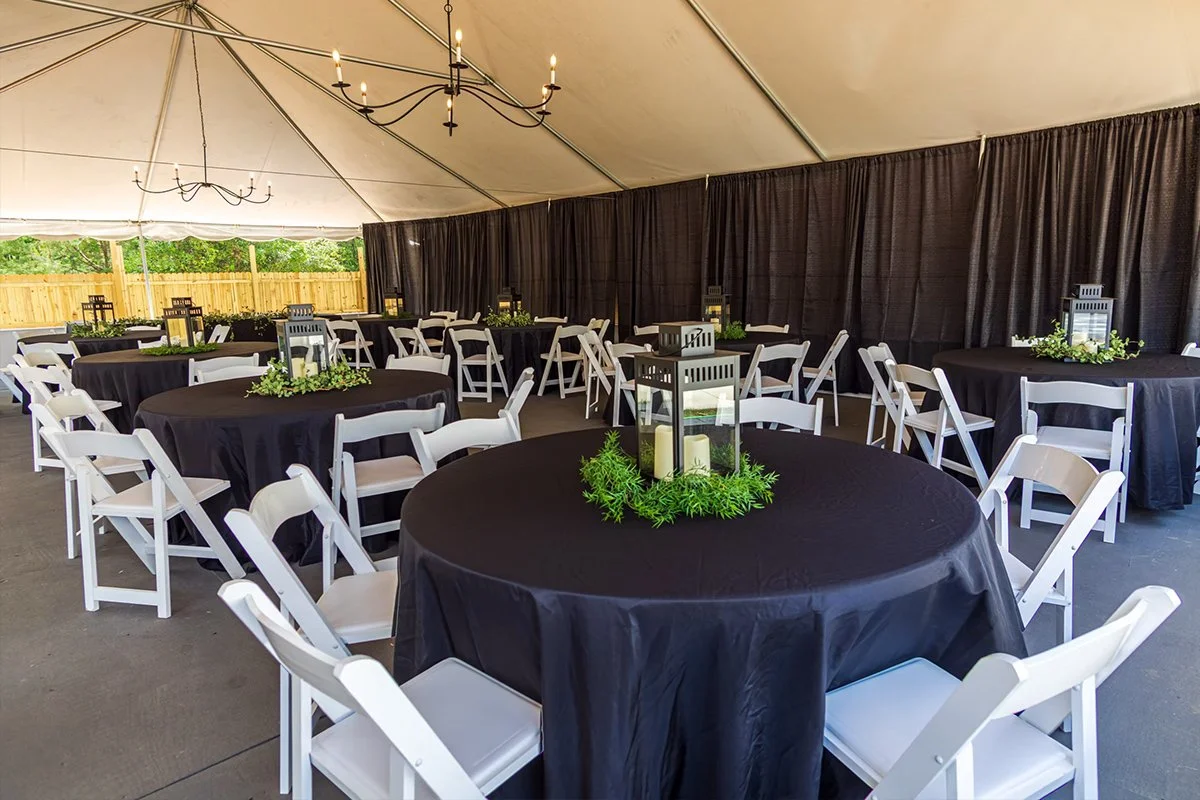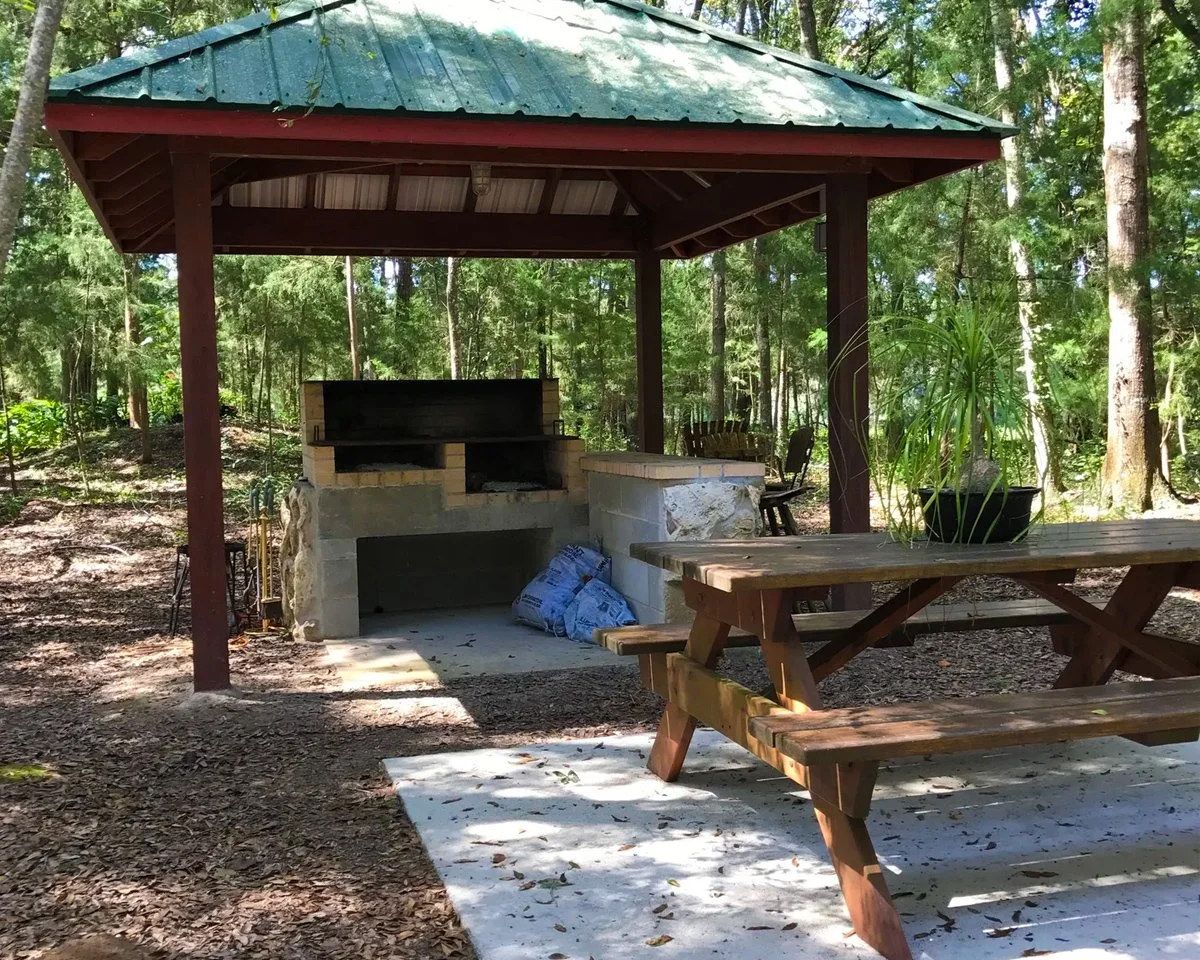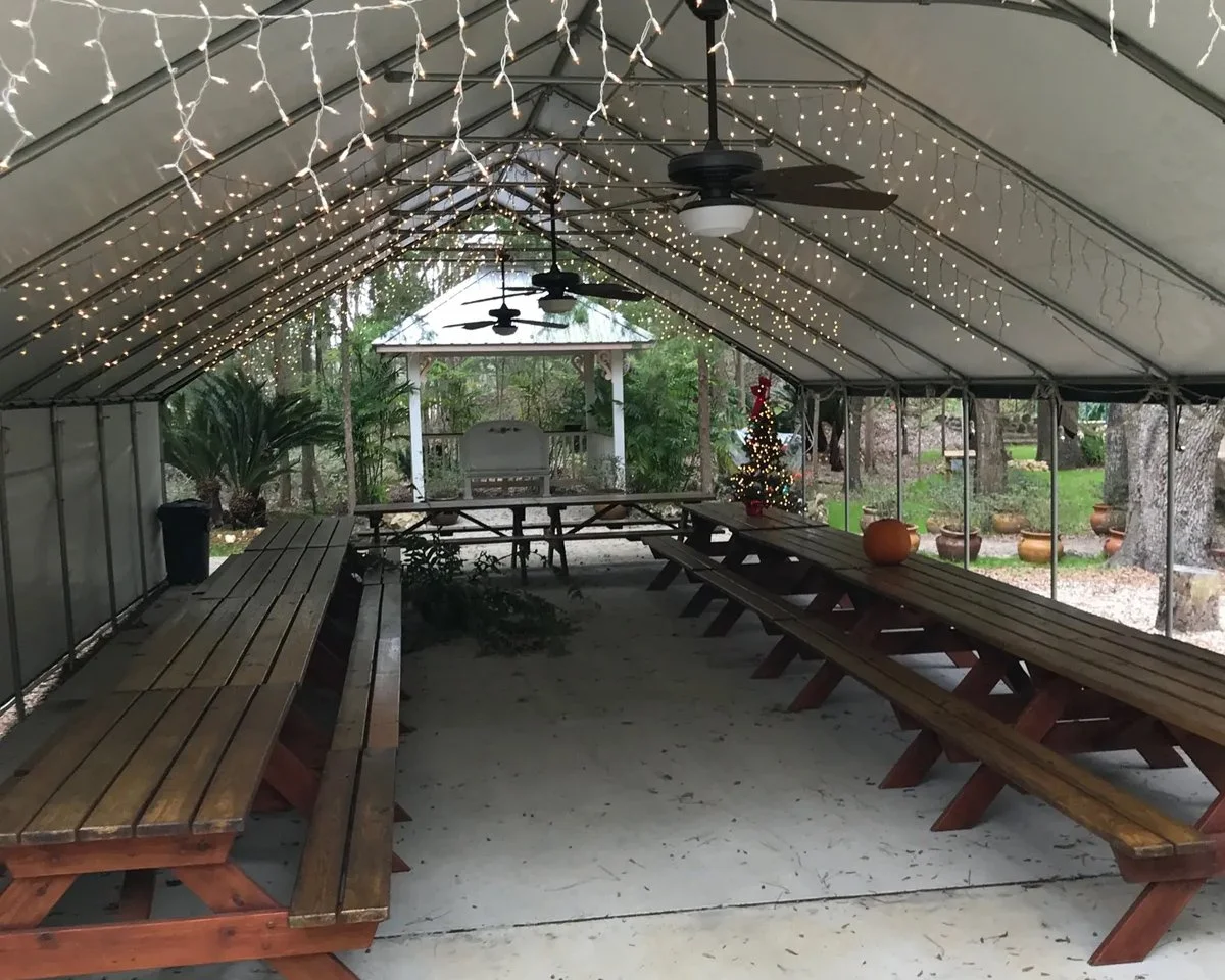The Picnic Tent & BBQ Grill: Located next to our Wedding Chapel, this open-air space comfortably seats up to 100 guests. Nestled under a lush canopy of majestic cedar and live oak trees, it provides plenty of natural shade and a peaceful backdrop for family or corporate gatherings.