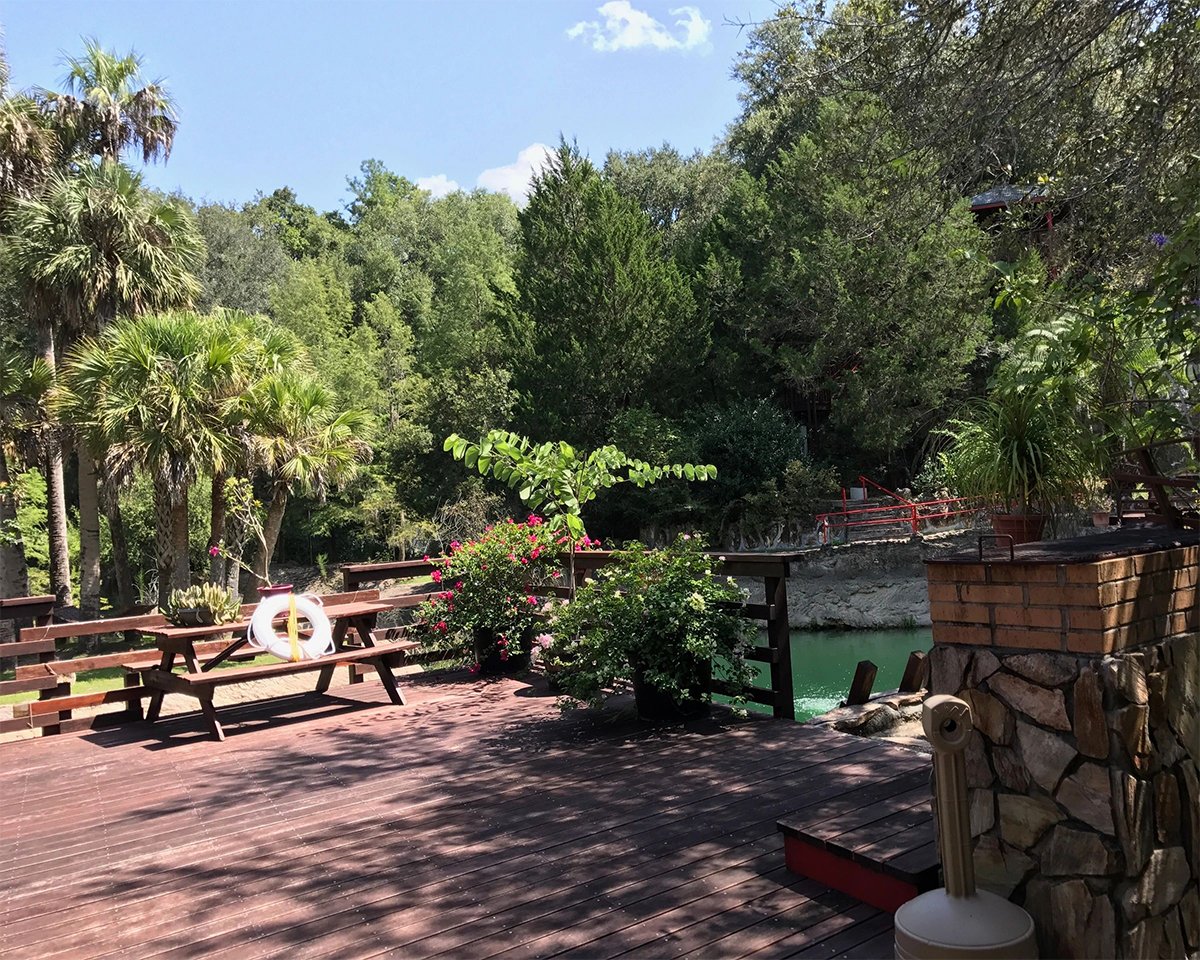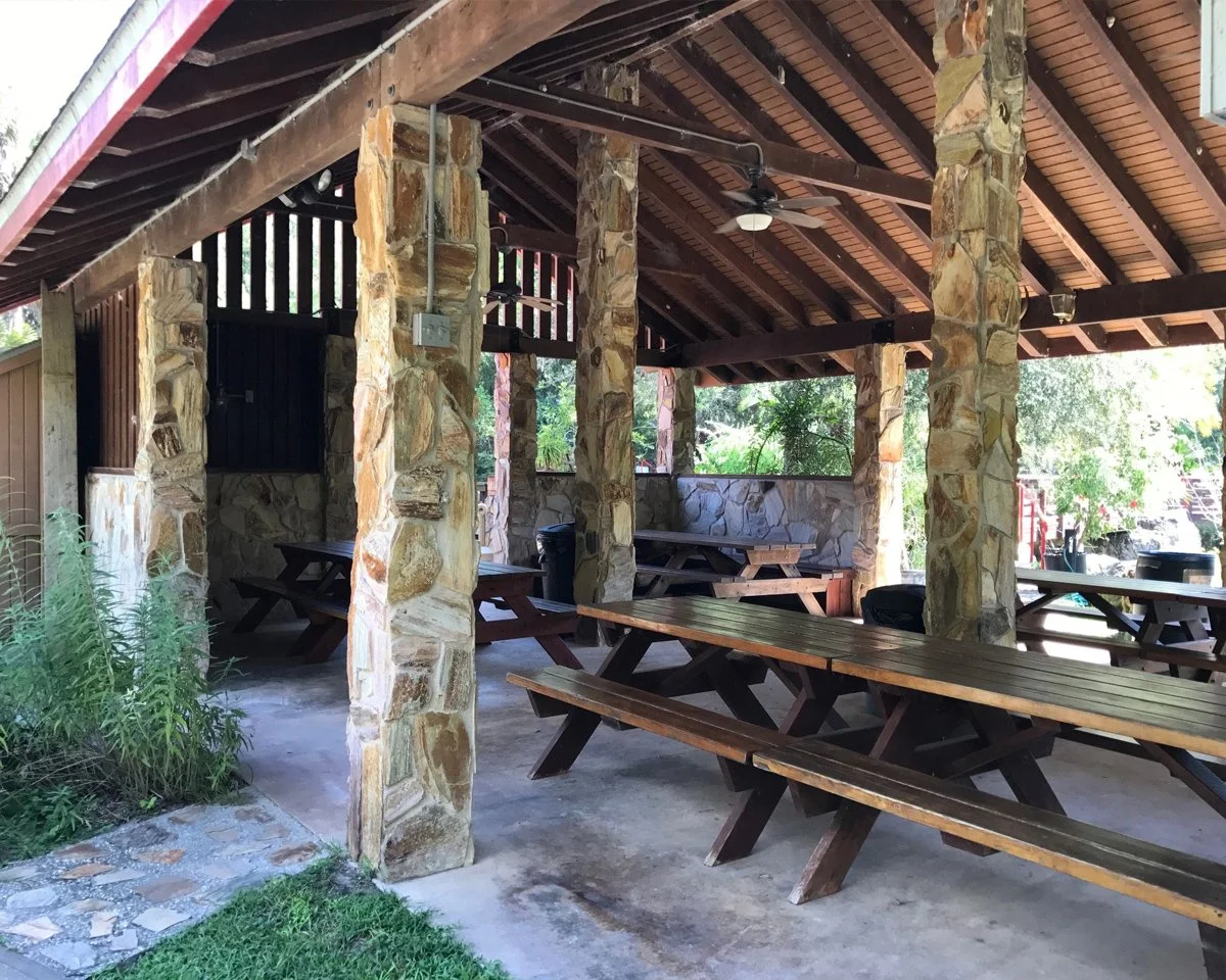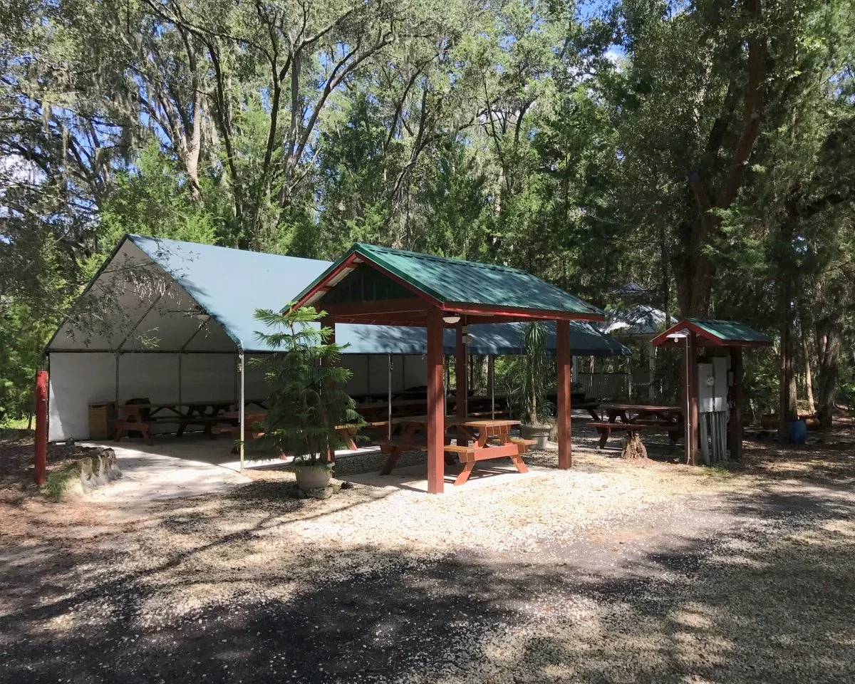 The Picnic Tent & BBQ Grill: Located next to our Wedding Chapel, this open-air space comfortably seats up to 100 guests. Nestled under a lush canopy of majestic cedar and live oak trees, it provides plenty of natural shade and a peaceful backdrop for family or corporate gatherings.